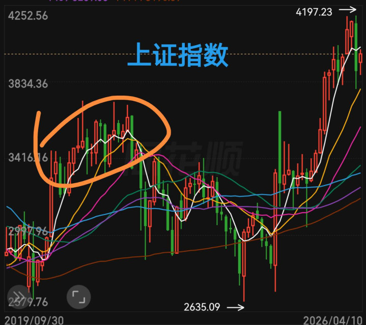 当今这个月线跟2020年就很像了,3800到4200的区间颤动。