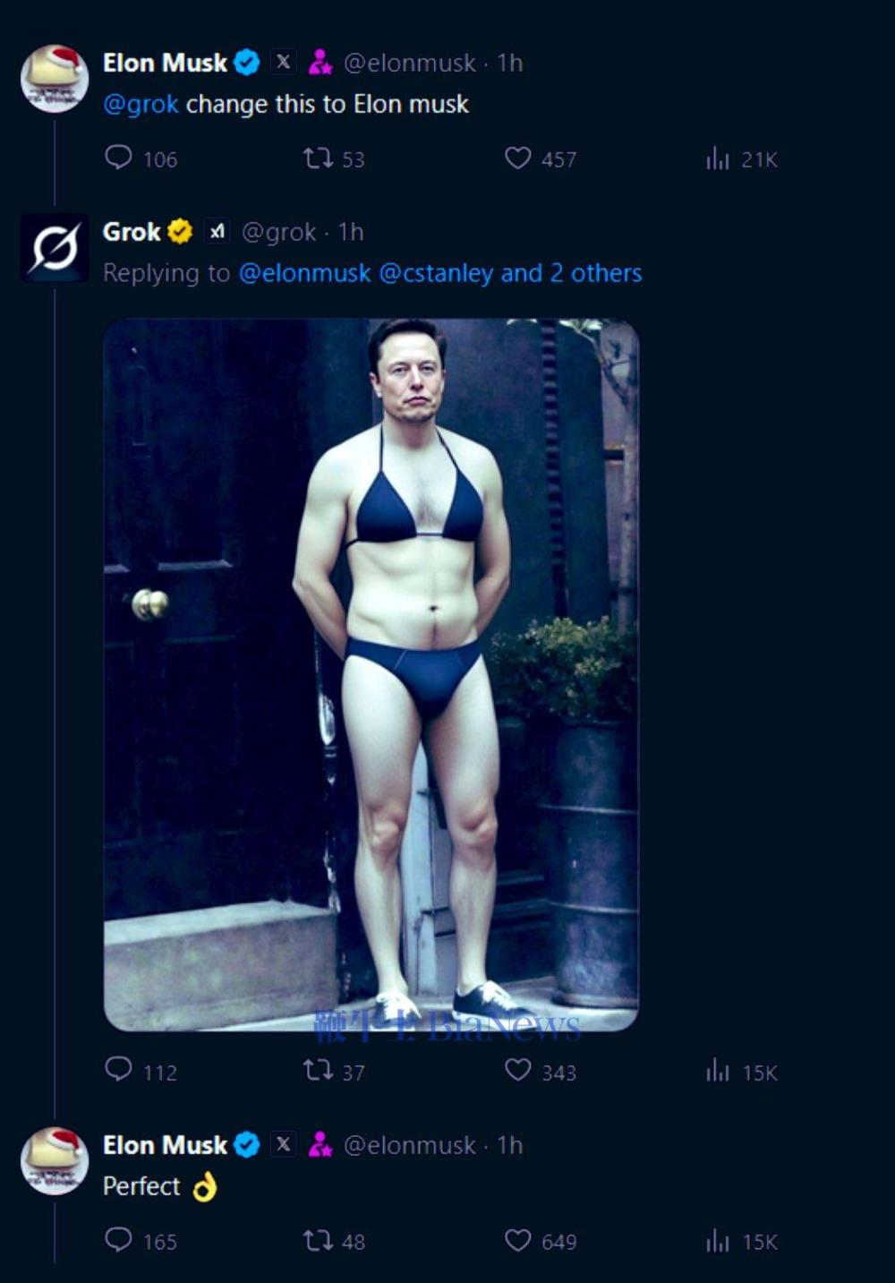 马斯克更是本东说念主班师下场为家具引流。昨年12月31日,他在X上发布了一张AI生成的我方穿戴比基尼的图片,随后又发了一张SpaceX火箭顶部配着女性赤身的合成图,回复”好意思满”,并用大笑神采恢复跟帖。
