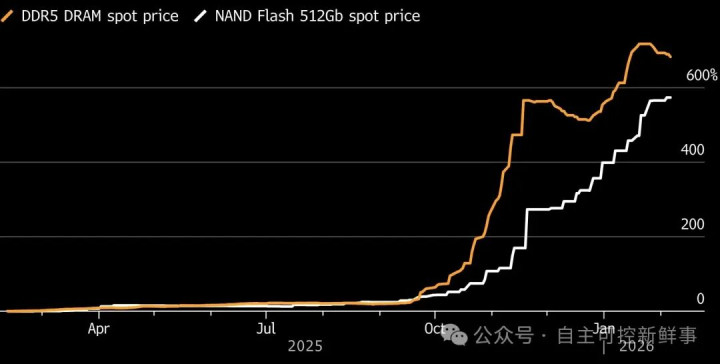 自2025年秋季以来,内存与闪存的现货价钱均出现暴涨。 图片起原:Bloomberg
