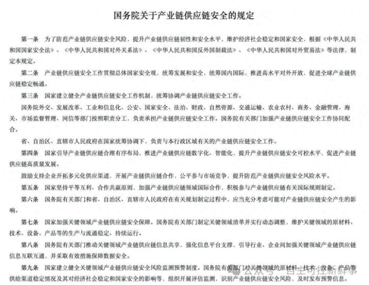 2026年4月7日,《国务院对于产业链供应链安全的轨则》细致发布,这是我国首部以国务院令表情明确叹气产业链供应链安全的专项行政国法。