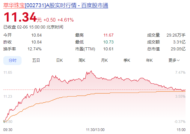 截至2月6日收盘,萃华珠宝报11.34元/股,上涨4.61%,总市值为29.05亿元。