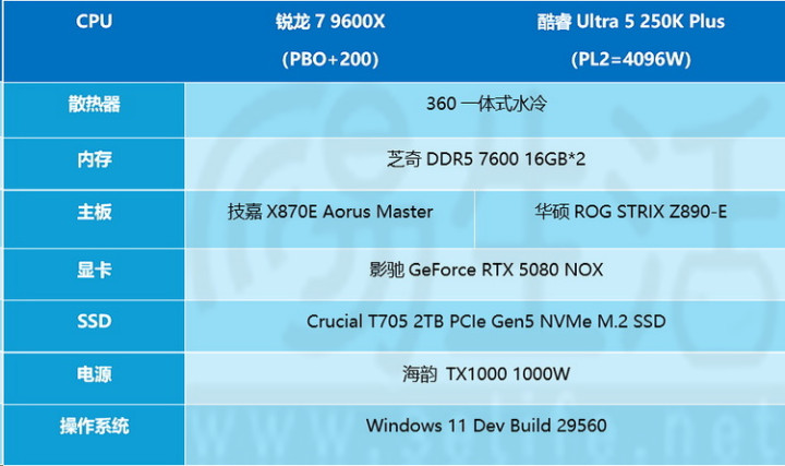 正因如斯,在这次测试的准备阶段,咱们并莫得选拔最顶级、但脱离人人的建设组合,而是及第了AMD 锐龙5 9600X和英特尔酷睿Ultra5 250K Plus,这两款更主流的CPU来进行测试。