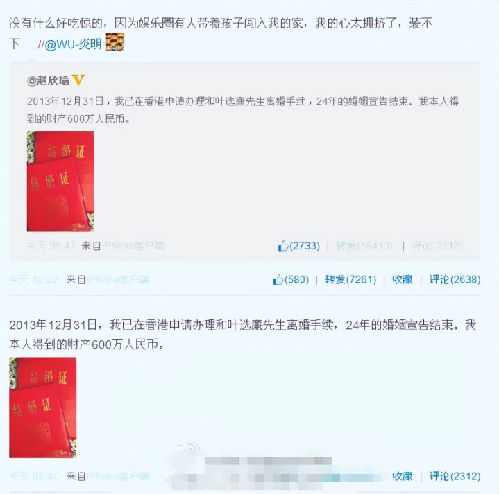 赵欣瑜再次更新微博,告示我方一经和叶选廉在香港办理了仳离手续,法令了这段片时的婚配。