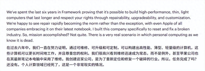 Patel在文中回顾了Framework昔日六年的竭力,诠释高性能、浮薄、可维修、可升级的札记本是可行的,并指出维修正从例外变为常态,“以致连苹果齐在最新札记本上拥抱了这一趋势”。